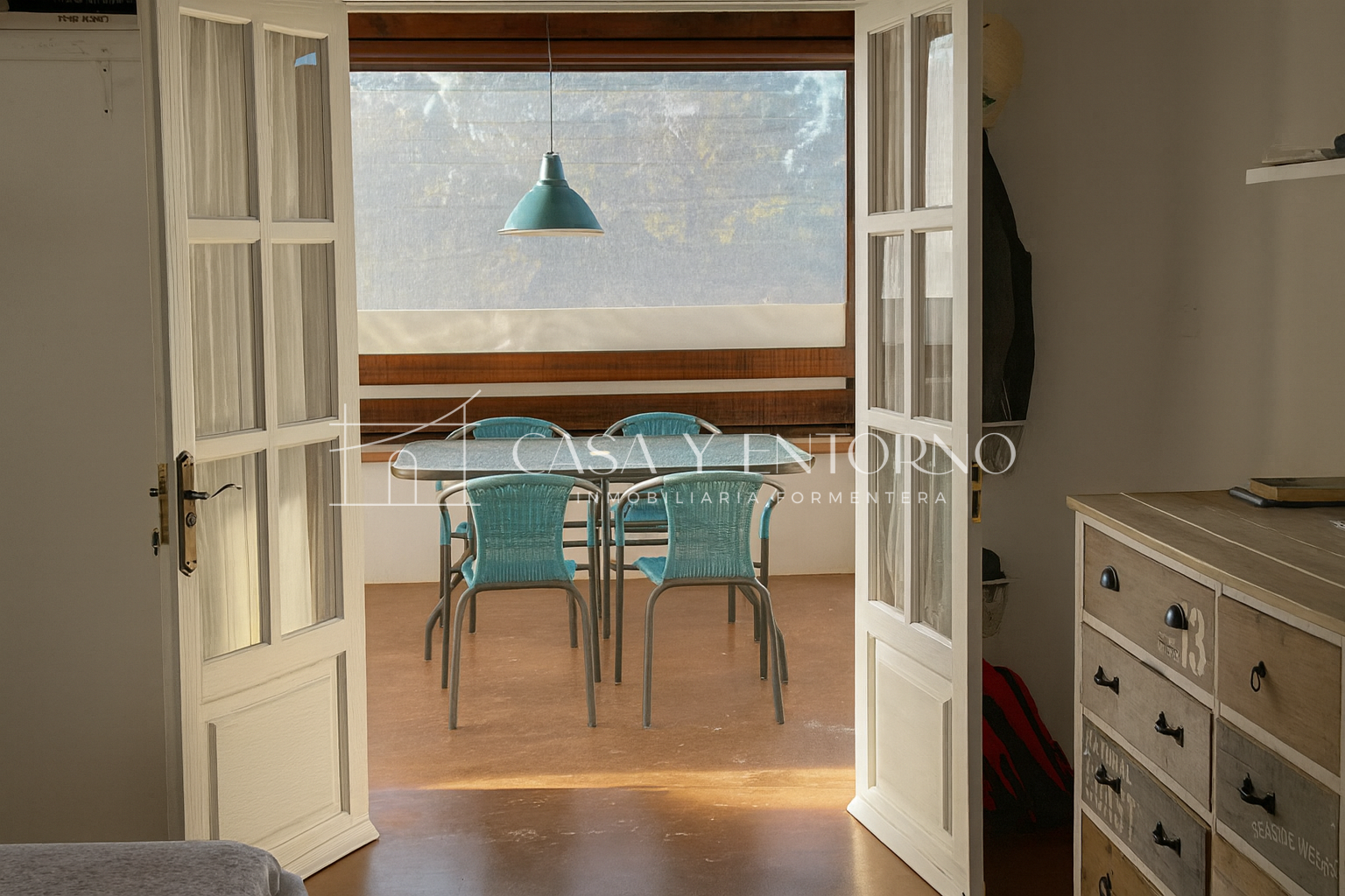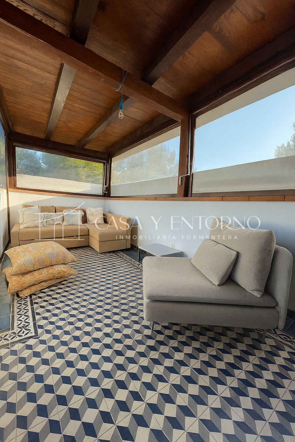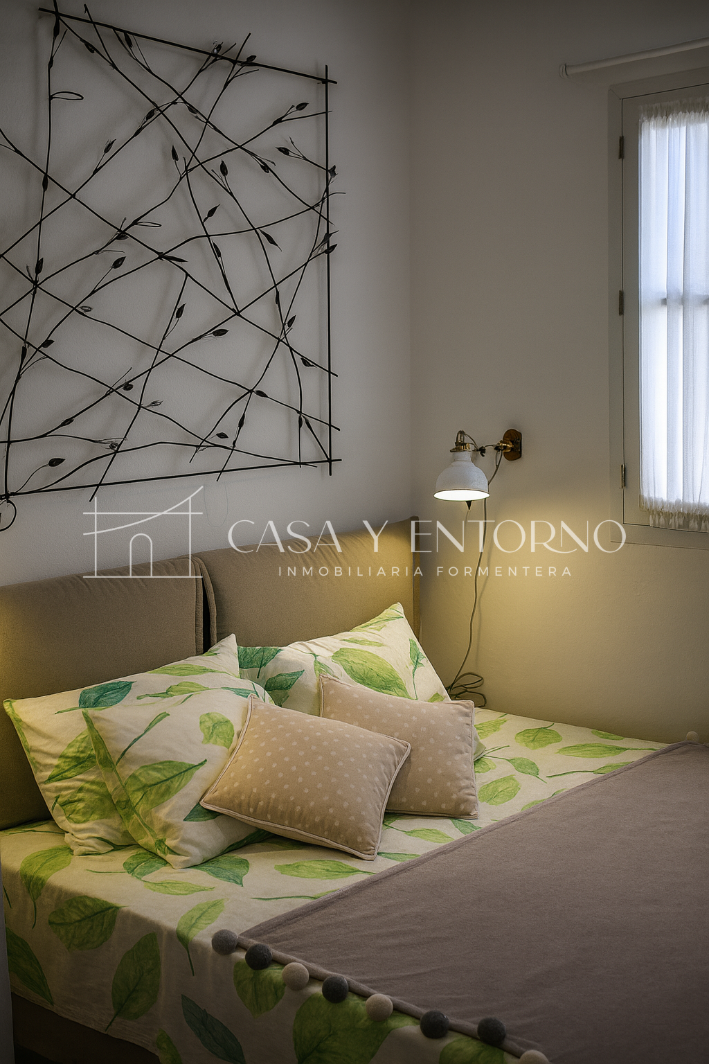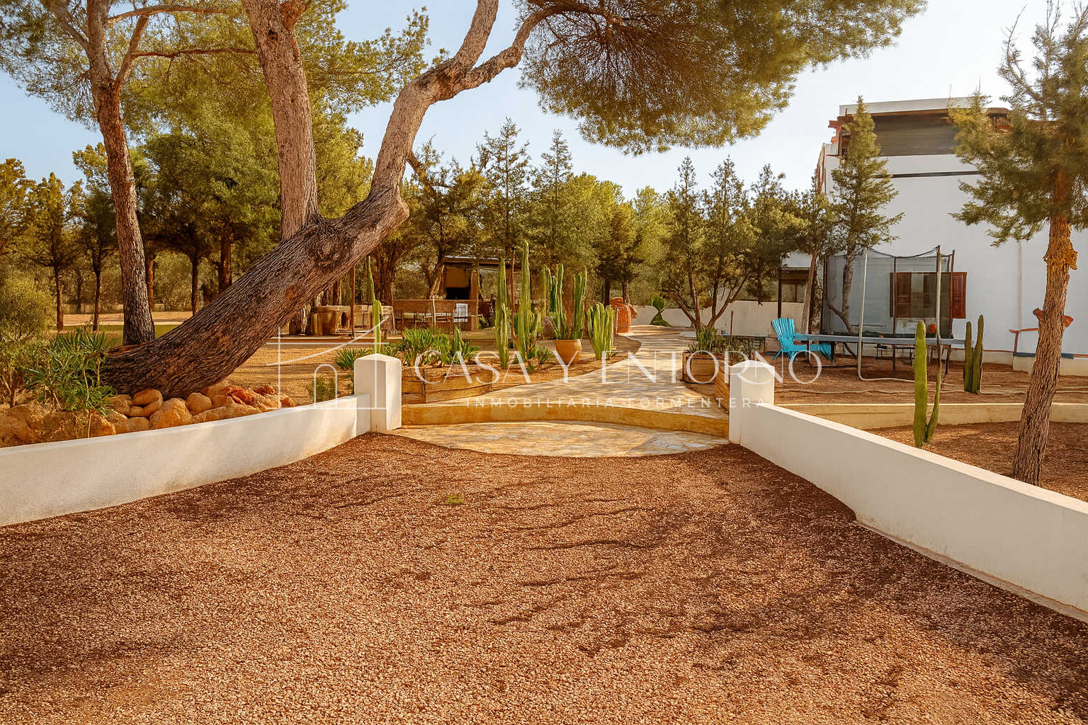 En el tranquilo entorno de Mitjorn, a solo 500 metros de la playa y a poca distancia del centro de Sant Francesc, se encuentra esta propiedad de 155 m² distribuida en dos plantas, capaz de combinar el carácter auténtico de Formentera con el confort moderno ideal para quienes desean disfrutar de la isla en total relajación. El amplio jardín privado de más de 1.000 m² rodea la casa y crea una atmósfera mediterránea única, con zonas sombreadas, árboles que aportan una agradable sensación de frescura y una barbacoa de obra perfecta para disfrutar al aire libre de las largas noches de verano. Completan los exteriores un aparcamiento privado y una práctica caseta/trastero, elementos muy útiles para la vida cotidiana.