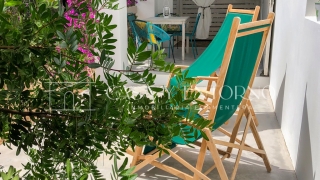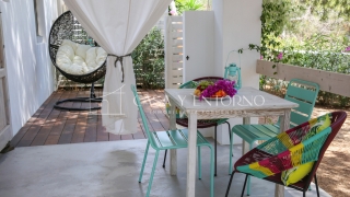 - Una casa de tres plantas de 160 m², que incluye: una terraza cubierta y amueblada en la entrada, un amplio comedor con vistas a la cocina, una sala de estar con vistas a una segunda terraza cubierta y amueblada (otro comedor). Desde esta terraza se accede al Hamman, que es espacioso y también dispone de ducha y aseos. En la primera planta hay dos amplios dormitorios dobles, con baño privado, y en la segunda planta, el tercer dormitorio, también amplio, con su propio baño (ducha con vistas al mar) y una gran terraza privada.