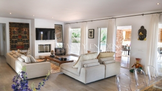 El interior de la villa es igualmente espectacular. Al entrar, un amplio salón se abre a una cocina moderna completamente equipada, creando un espacio perfecto para recibir invitados o pasar tiempo en familia. Las cinco habitaciones en la planta baja, cada una con baño privado, ofrecen intimidad y privacidad. La suite principal destaca por su amplitud, luminosidad, elegancia y confort.