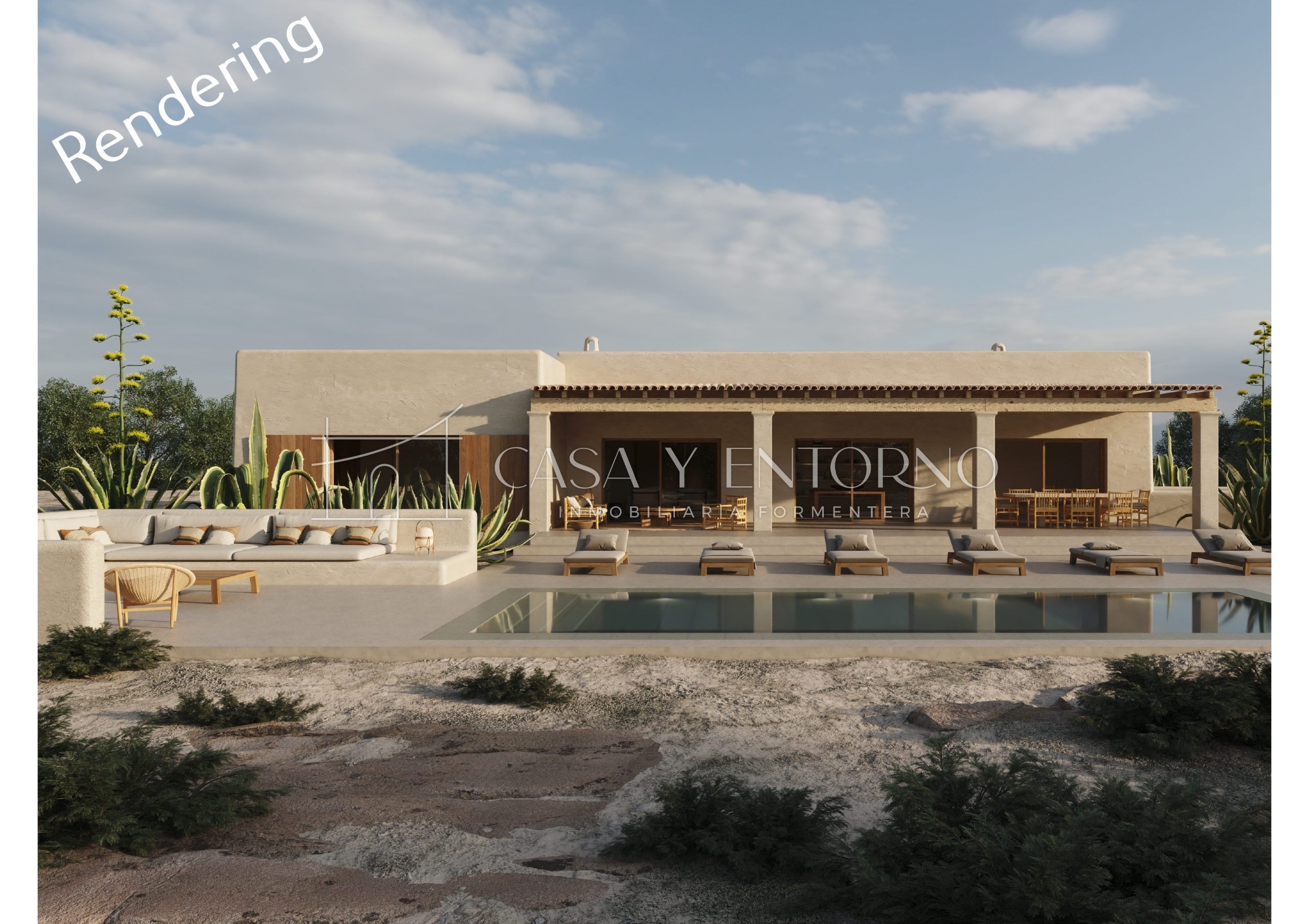 En el exterior, la villa revela su lado más emocional: una piscina esencial, elegante y perfectamente integrada en el terreno, donde el agua refleja el cielo y los colores cambiantes de la isla creando una atmósfera suspendida y contemplativa. Alrededor de la piscina cobra vida una zona chill de gran encanto, con sofás de piedra integrados con grandes cojines claros, elementos de madera natural y tumbonas que completan el armonioso escenario veraniego, ofreciendo un espacio ideal para relajarse, leer o simplemente contemplar el silencio de Formentera, transformando cada momento en una experiencia sensorial. Esta villa de lujo en Es Cap de Barbaria es un equilibrio excepcional entre arquitectura contemporánea, materiales auténticos, privacidad total y una conexión profunda con la naturaleza: una residencia exclusiva pensada para quienes desean vivir el lujo de forma auténtica, discreta y emocional, en uno de los lugares más prestigiosos de las Baleares.