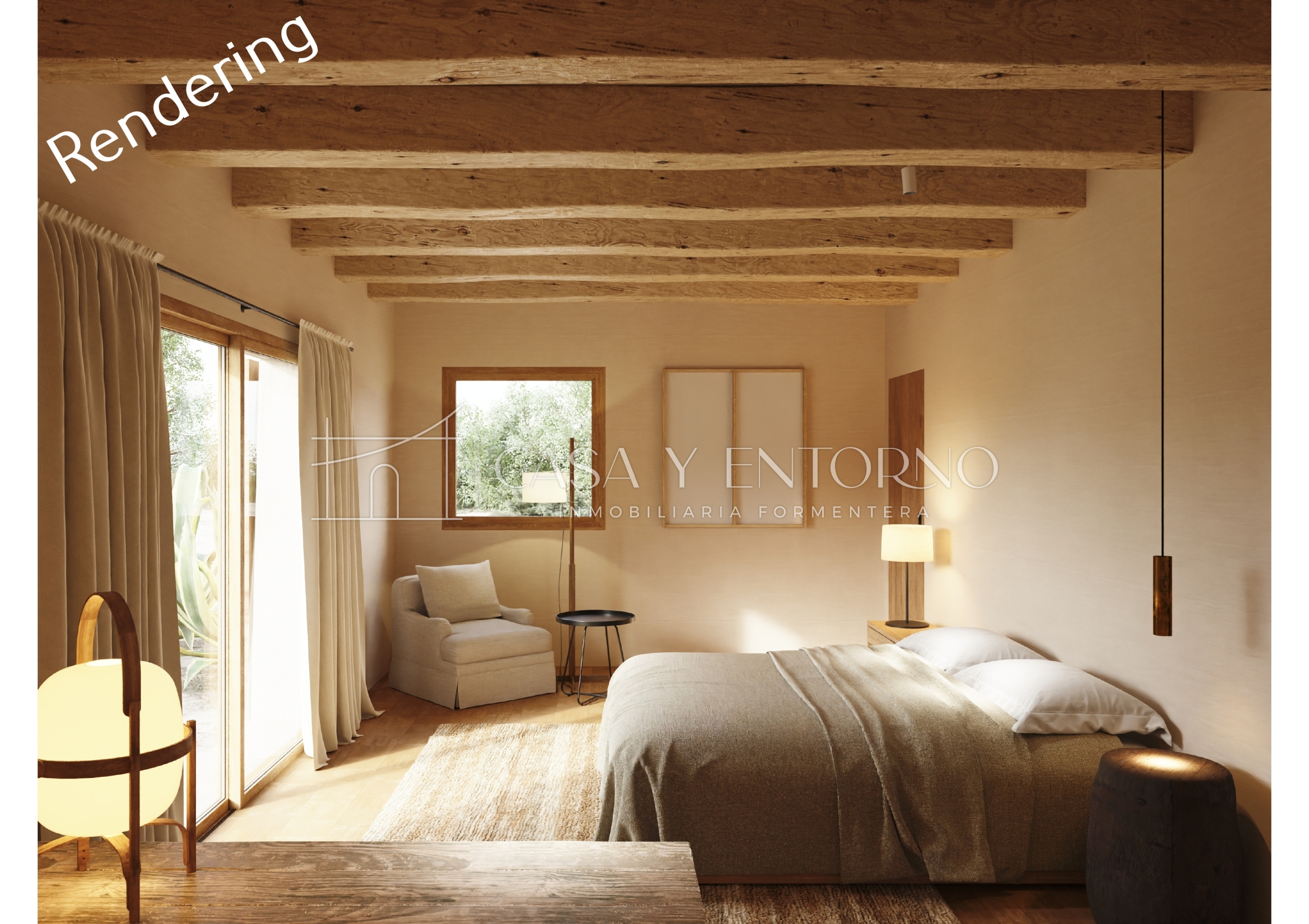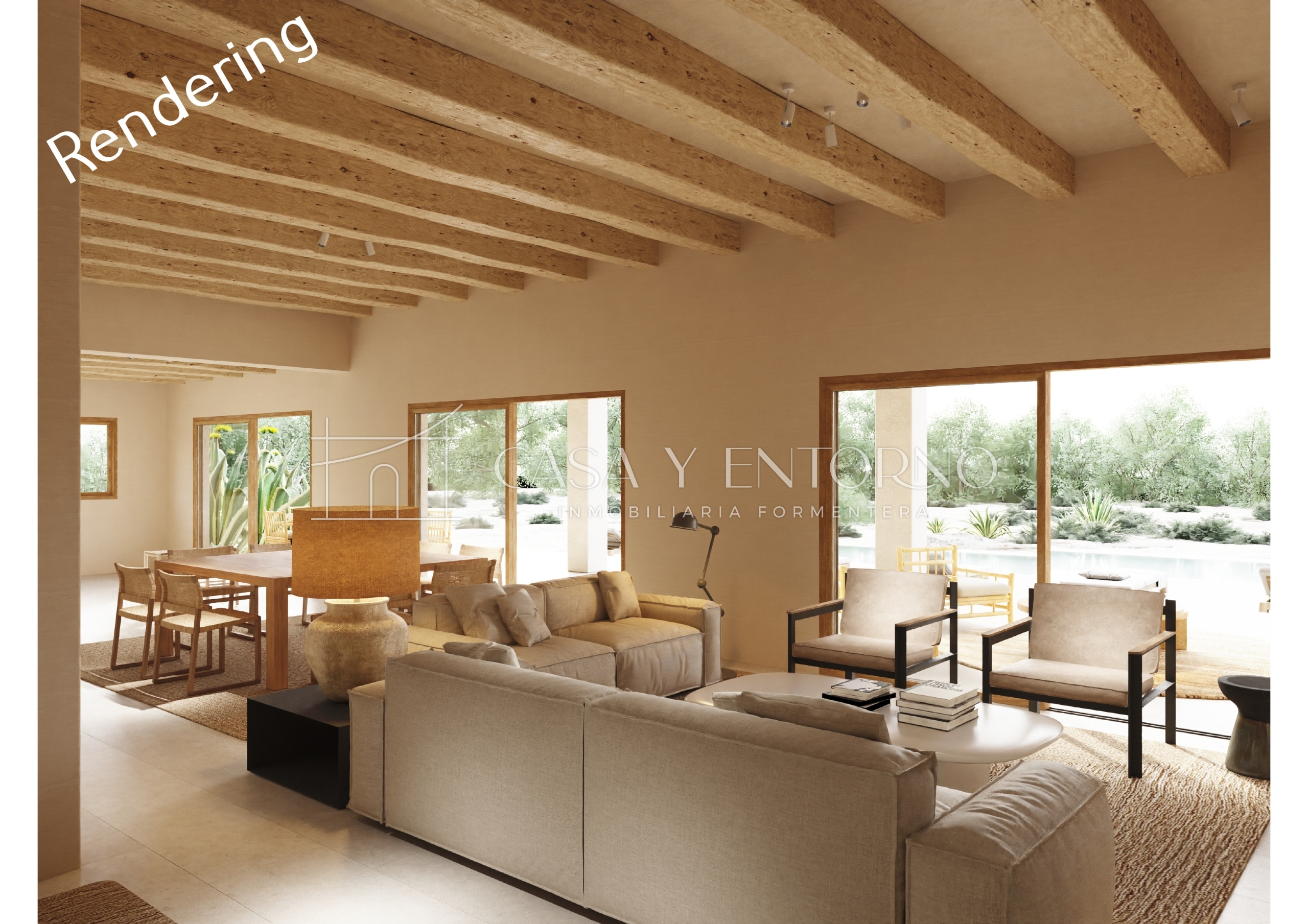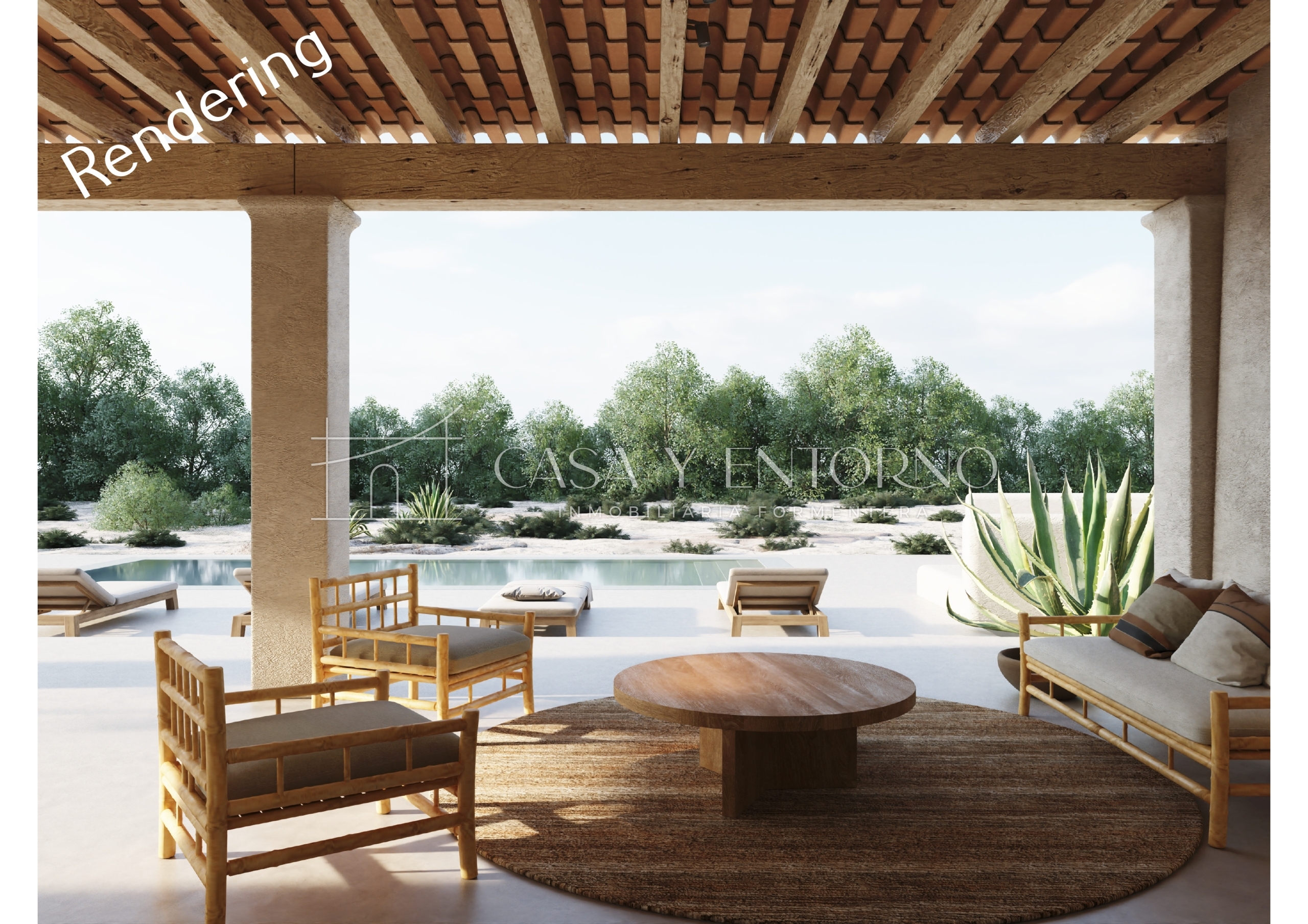 En el exterior, la villa revela su lado más emocional: una piscina esencial, elegante y perfectamente integrada en el terreno, donde el agua refleja el cielo y los colores cambiantes de la isla creando una atmósfera suspendida y contemplativa. Alrededor de la piscina cobra vida una zona chill de gran encanto, con sofás de piedra integrados con grandes cojines claros, elementos de madera natural y tumbonas que completan el armonioso escenario veraniego, ofreciendo un espacio ideal para relajarse, leer o simplemente contemplar el silencio de Formentera, transformando cada momento en una experiencia sensorial. Esta villa de lujo en Es Cap de Barbaria es un equilibrio excepcional entre arquitectura contemporánea, materiales auténticos, privacidad total y una conexión profunda con la naturaleza: una residencia exclusiva pensada para quienes desean vivir el lujo de forma auténtica, discreta y emocional, en uno de los lugares más prestigiosos de las Baleares.